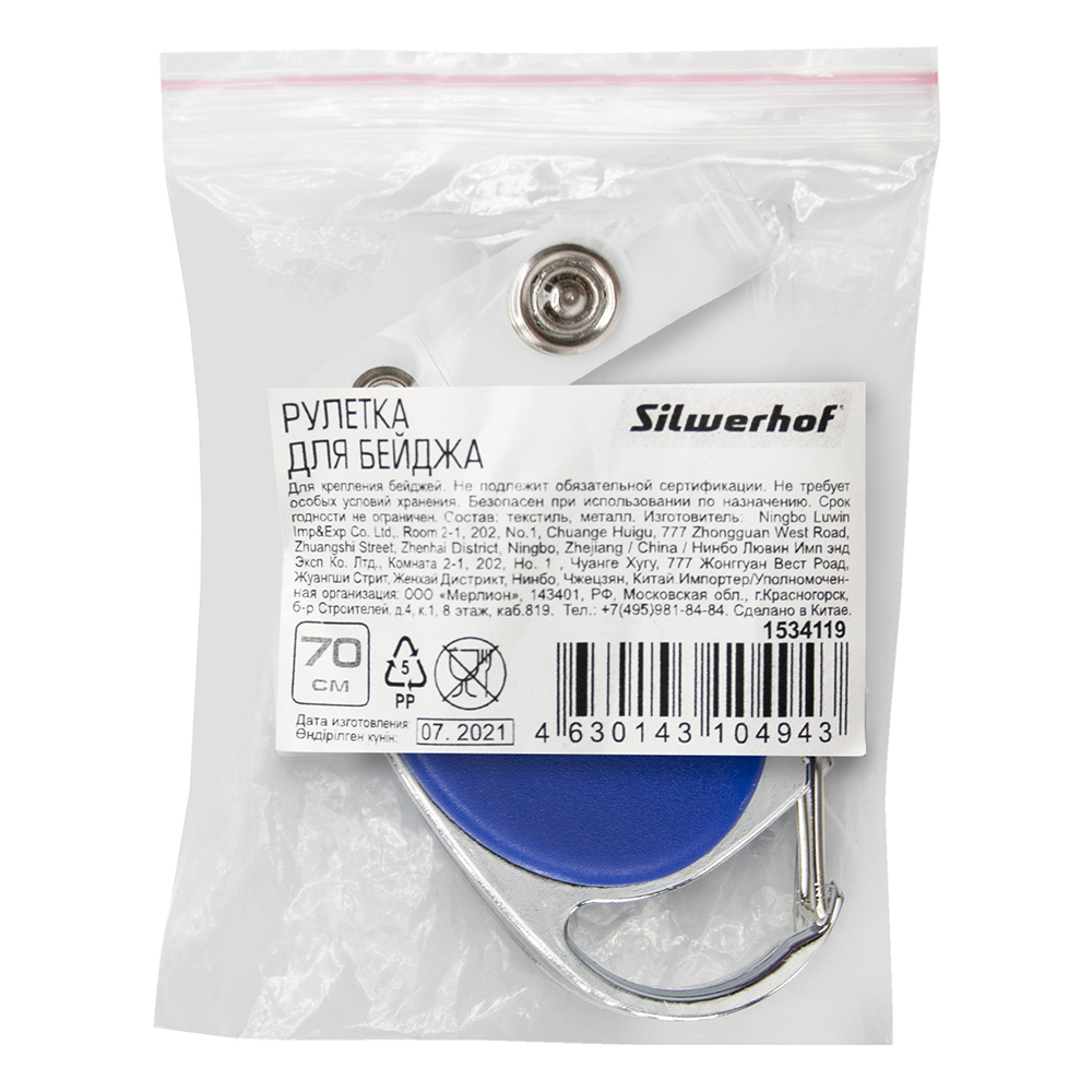 Брелок-ретрактор с вытяжной нитью синий в блистере защелкивающийся 70 см (Silwerhof)