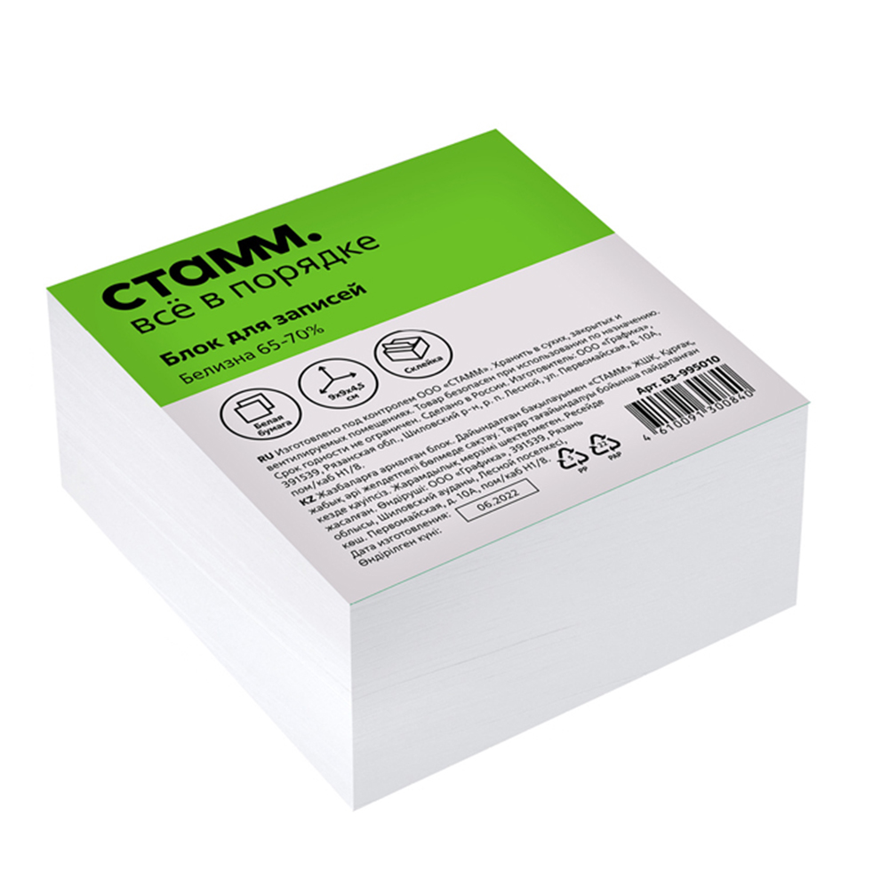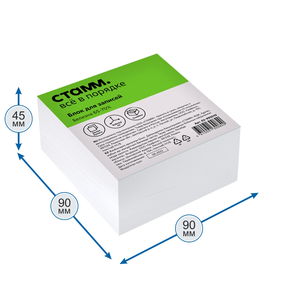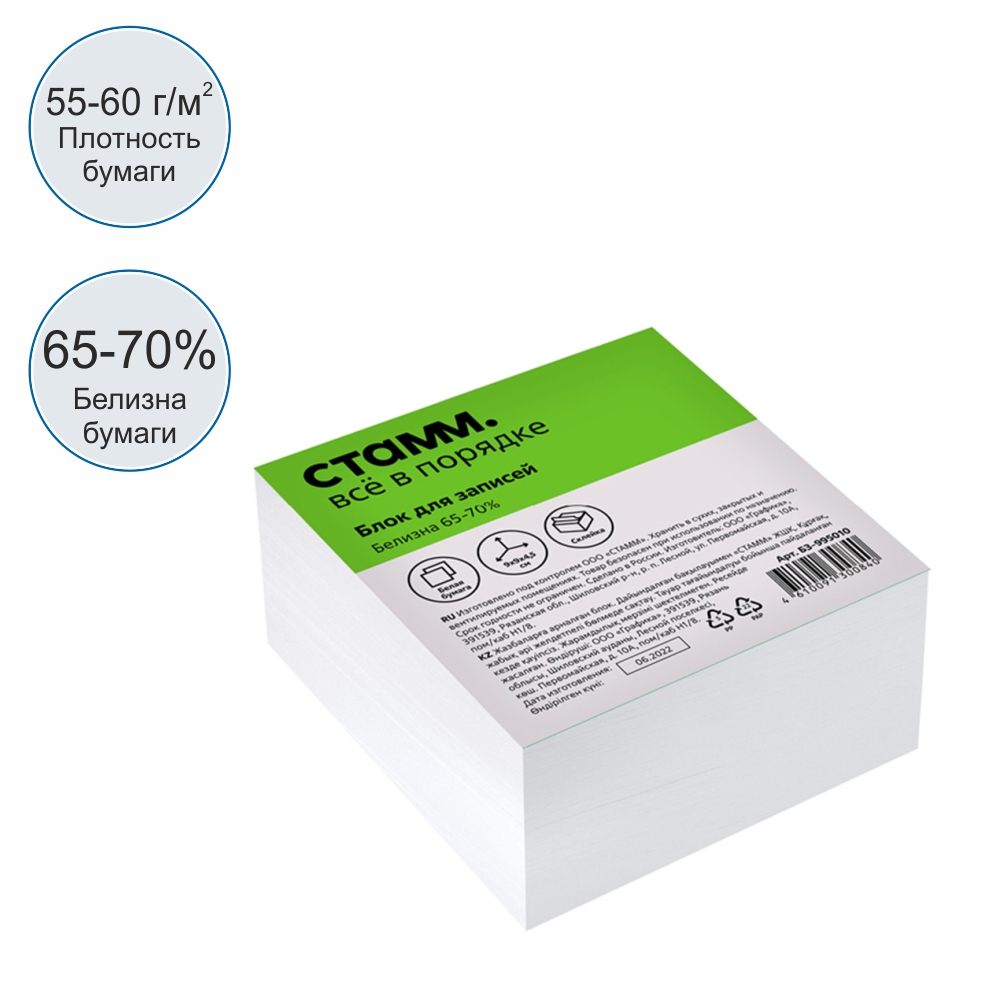 Бумага для записей Стамм, 90×90×45 мм, белая, белизна 65–70%.