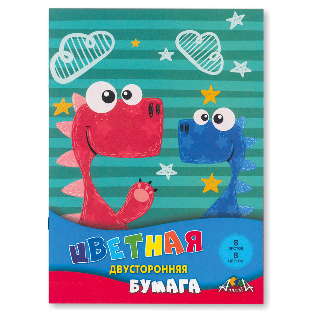Бумага цветная в наборе - 205х280 8л. 8цв. "Друзья-динозаврики" двусторонняя (КТС)