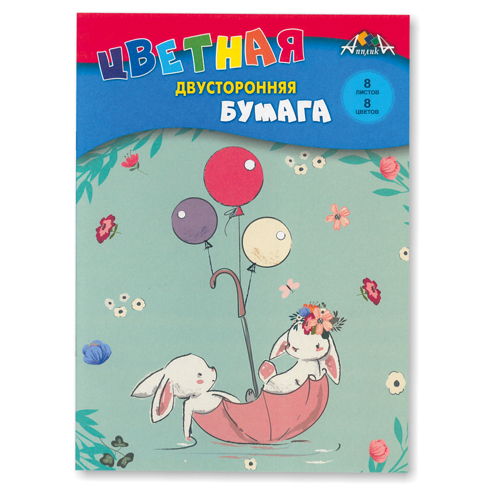 Бумага цветная в наборе - 205х280 8л. 8цв. "Зайчата" двусторонняя (КТС)