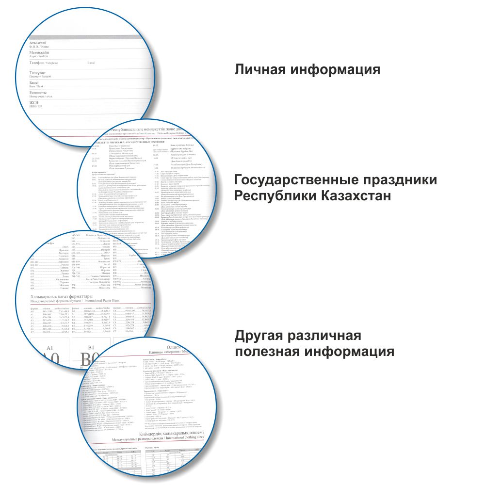 - разделы справочной информации - карта Казахстана, коды стран, международные форматы бумаги, единицы измерения, международные размеры одежды и государственные праздники РК.
