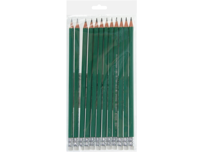 Простые чернографитовые карандаши с ластиком - HB (твердо-мягкие) «Dolce Costo», в наборе 12 штук, цвет деревянной оправы - зеленый, предназначены для создания рисунков, эскизов, черчения. Карандаш незаменимый канцелярский помощник, не оставляет неопрятных следов, легко стирается небольшим белым ластиком. Ластик в верхней части карандаша - удобное дополнение. Качественный пишущий грифель карандаша не крошится, он вставлен в оправу из натурального дерева, которая легко затачивается. Форма карандаша шестигранная, предварительно заточен.