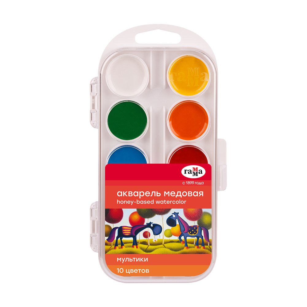 Медовая акварель серии «Мультики» от торговой марки «Гамма» разработана с учетом рекомендаций педагогов. Идеально подходит для занятий рисованием в детском саду, школе и дома. Яркие чистые цвета развивают фантазию и интерес к творчеству. Акварель безопасна для детей. Удобный пластиковый пенал, крышка плотно фиксируется и служит палитрой для смешивания красок. Кюветы с высокими бортиками и увеличенным расстоянием между красками предназначены для удобства в работе детей. Акварель легко смывается с рук и отстирывается с одежды.