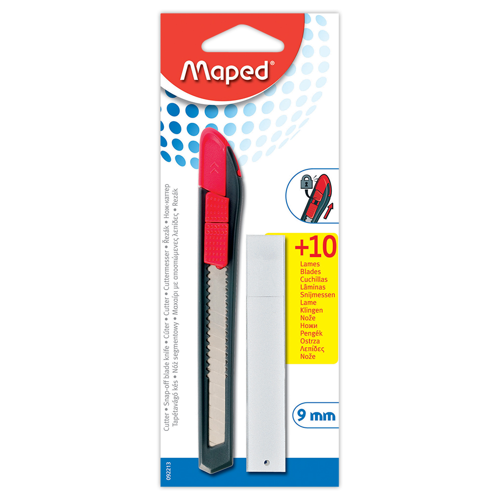 Макетный нож Maped Start с шириной лезвия 9 мм — идеальный инструмент для точной и аккуратной резки бумаги, картона и других материалов. В комплект входят 10 сменных лезвий, что делает набор практичным и долговечным. Удобная блистерная упаковка позволяет легко хранить нож и лезвия.