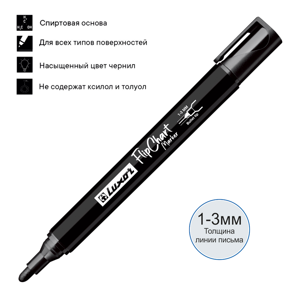 Маркер для флипчарта от бренда "Luxor" предназначен для письма на бумажных блоках флипчарта.  Яркий, насыщенный цвет не просачивается на следующие листы. Идеальны при проведении корпоративных совещаний, презентаций, обучений. Дизайн простой, круглая форма корпуса из пластика, обеспечивает дополнительное удобство при использовании. Цвет - черный. Толщина: 1-3 мм.