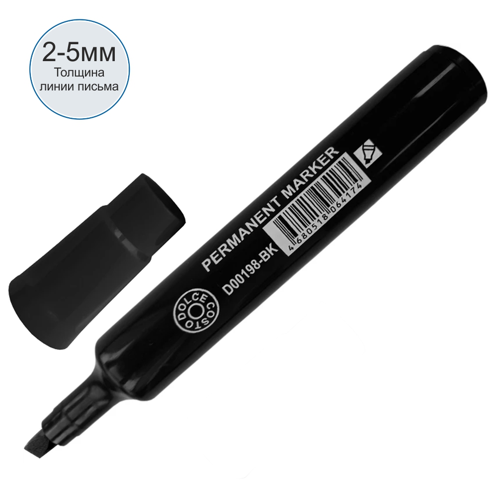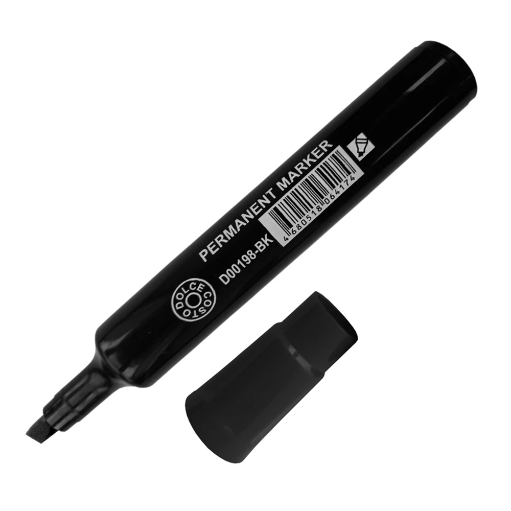 Перманентный маркер «Dolce Costo» (ФинСиб) — надёжный инструмент для письма и маркировки на различных поверхностях. Черные чернила стойкие, быстро высыхают и обеспечивают яркие и чёткие линии. Скошенный наконечник позволяет создавать линии разной толщины — от тонких до широких, что делает маркер универсальным для подписей, надписей и разметки.