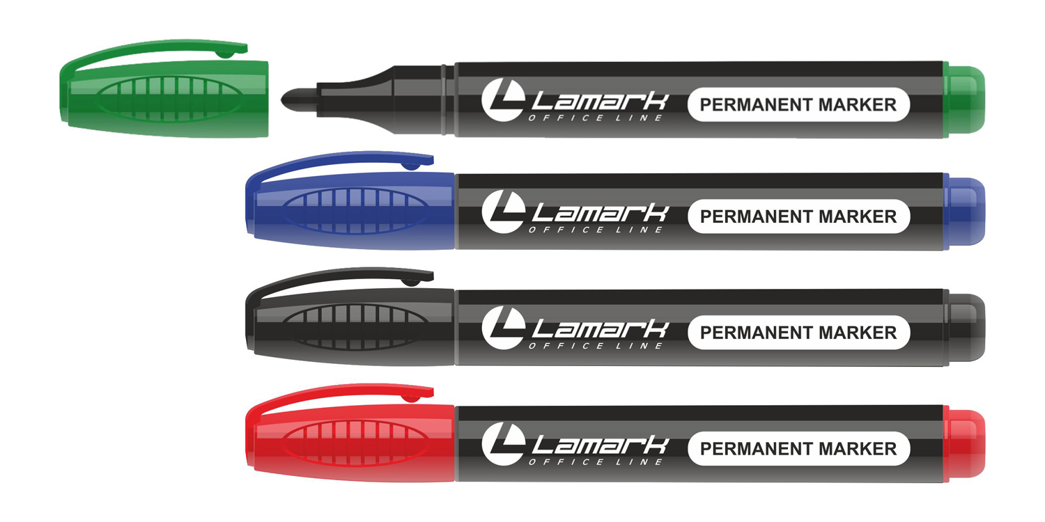 Набор маркеров перманентных Lamark из четырех цветов (черный, синий, красный, зеленый).