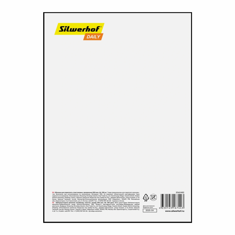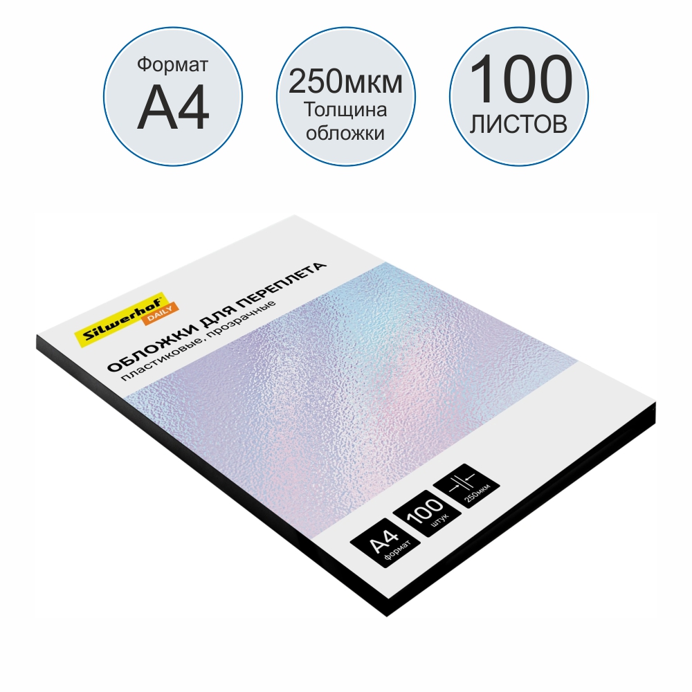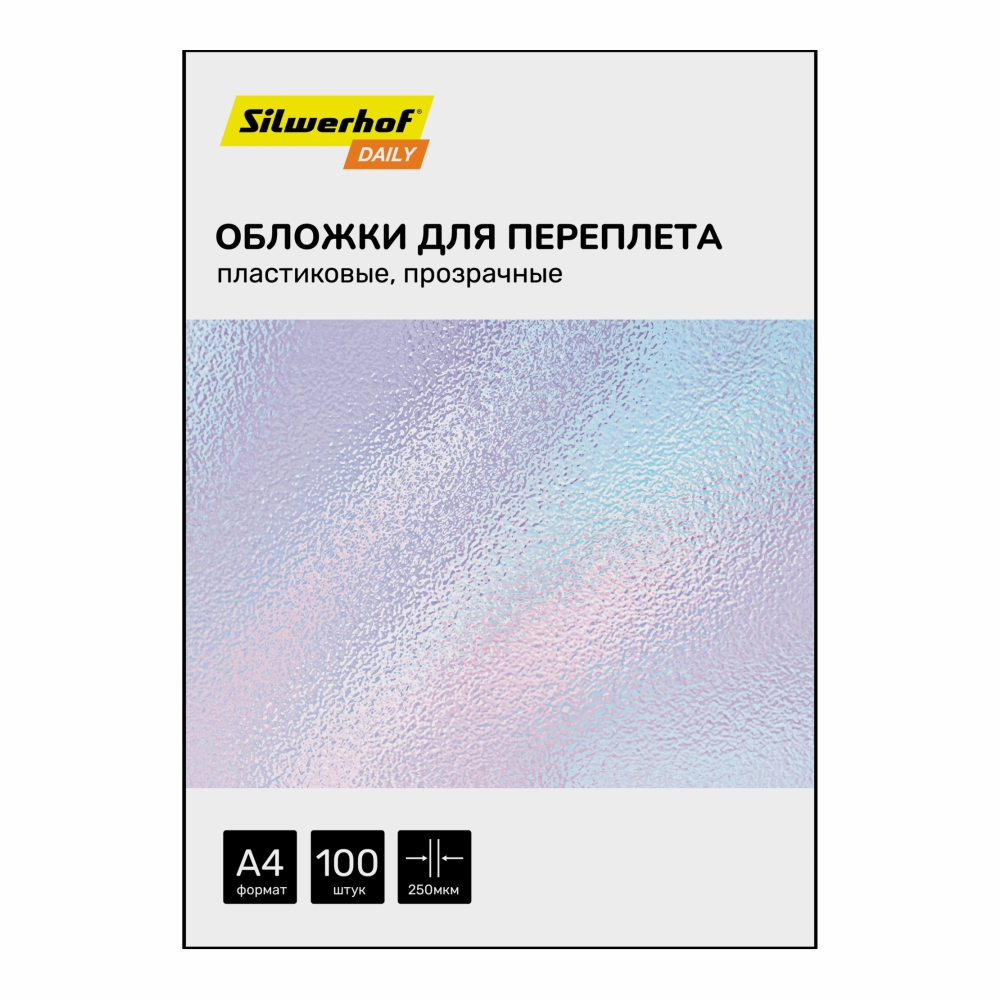 Пластиковые обложки для переплета Silwerhof Daily — надежное решение для защиты документов и тетрадей. Прозрачный материал толщиной 250 мкм обеспечивает долговечность и позволяет видеть содержимое, а набор из 100 штук идеально подходит для офиса, учебы или творчества.