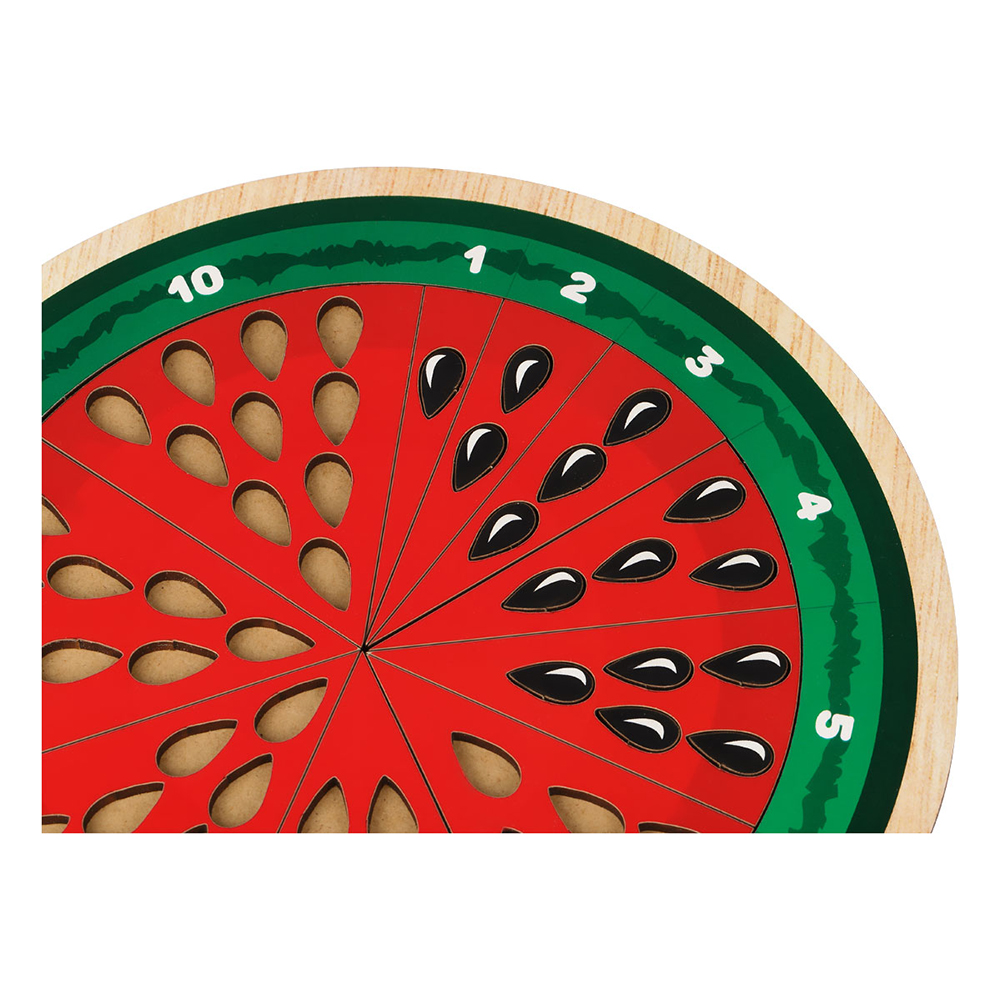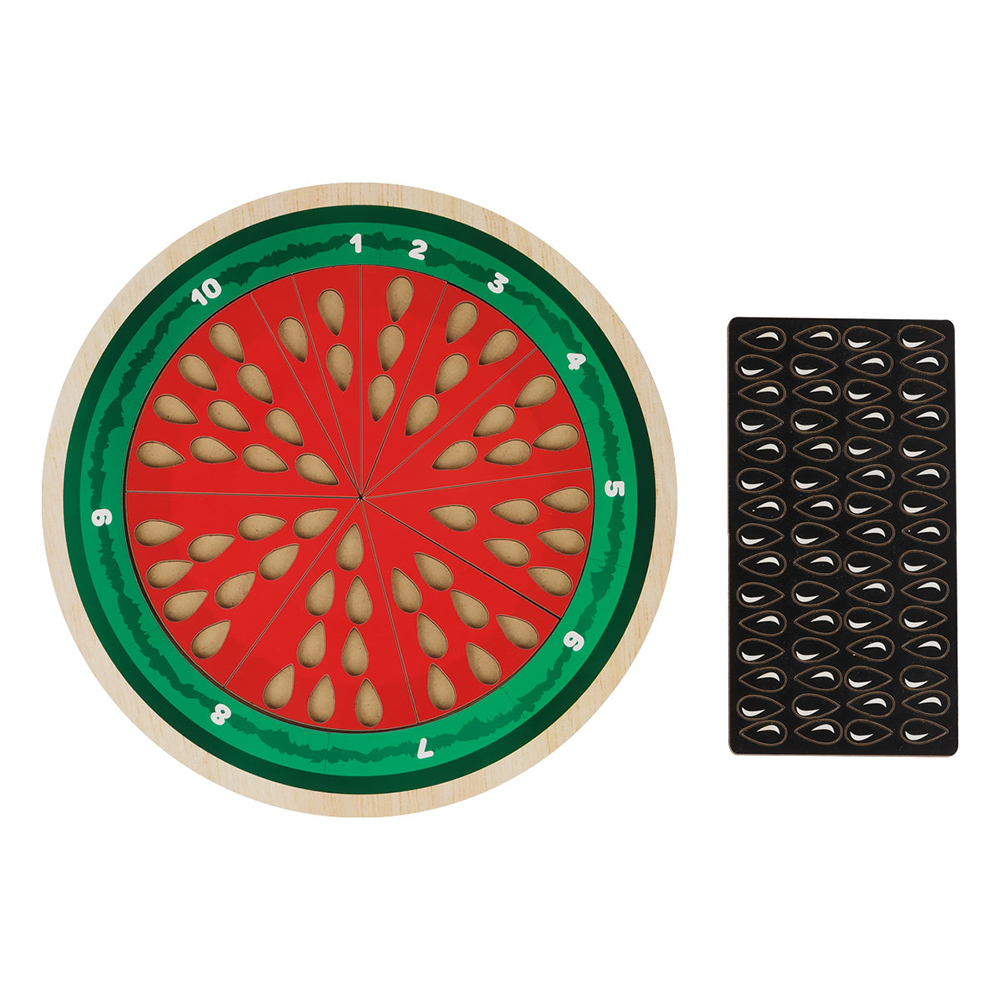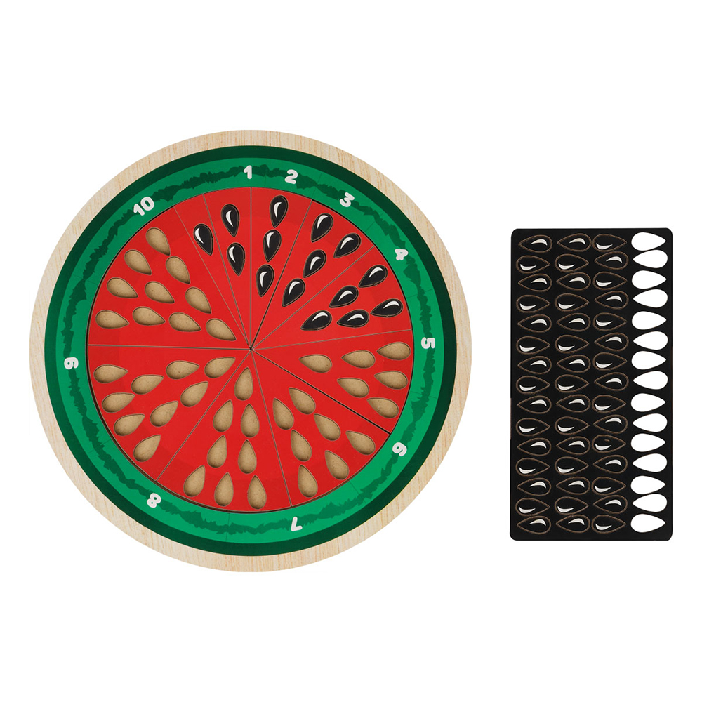 Обучающая игра «Арбуз» от бренда «Три совы» многофункциональна. С помощью нее можно учить ребенка основам счета, объяснить значение цифр, долей. В игрушке есть прорези для вкладывания семечек, которые одновременно являются счетным материалом. С их помощью можно решать простейшие математические примеры. Игрушка развивает мелкую моторику, логическое и аналитическое мышление, память.