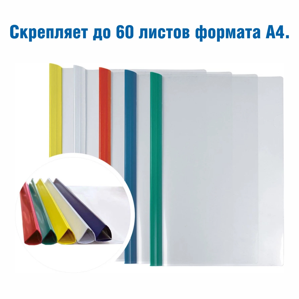 Папка-бегунок А4, 60 листов, прозрачная с цветным корешком (ФинСиб) — простое и удобное решение для подшивки документов без использования перфорации. Прозрачная обложка позволяет легко просматривать содержимое, а прочный цветной ползунок надёжно фиксирует бумаги.