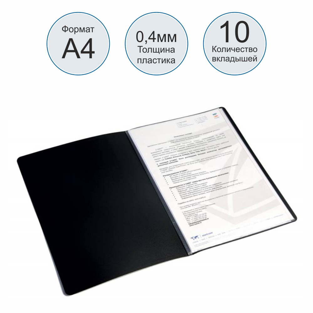 Изготовлена из прочного пластика толщиной 0,4 мм, который защищает бумаги от пыли, влаги и механических повреждений. Внутри расположено 10 прозрачных файлов, позволяющих удобно организовать документы, отчёты или учебные материалы.