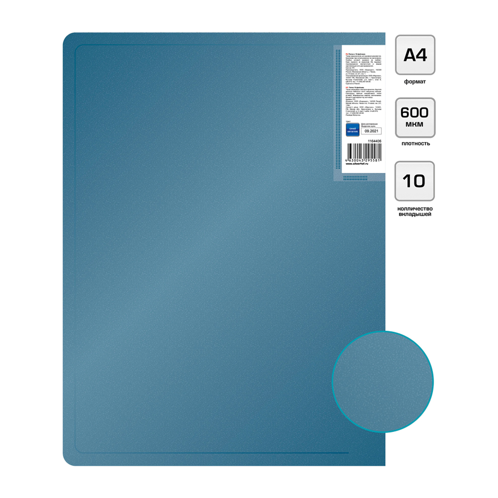 Изготовлена из прочного пластика толщиной 0,6 мм, который надёжно защищает бумаги от влаги, пыли и механических повреждений. Внутри расположено 10 прозрачных файлов, что позволяет удобно хранить отчёты, презентации и рабочие материалы.