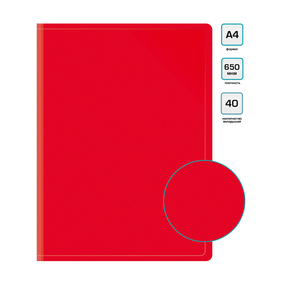 Изготовлена из прочного пластика толщиной 0,65 мм, который защищает бумаги от пыли, влаги и механических повреждений. Внутри расположено 40 прозрачных файлов, что позволяет удобно сортировать документы, отчёты и учебные материалы.