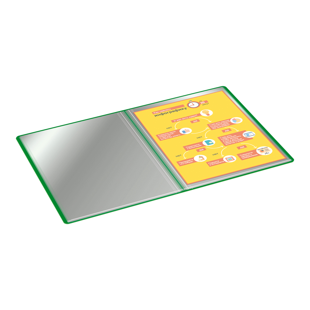 Изготовлена из прочного пластика толщиной 0,70 мм, который защищает бумаги от влаги, пыли и механических повреждений. Внутри расположено 60 прозрачных файлов, что позволяет систематизировать и быстро находить нужные материалы.