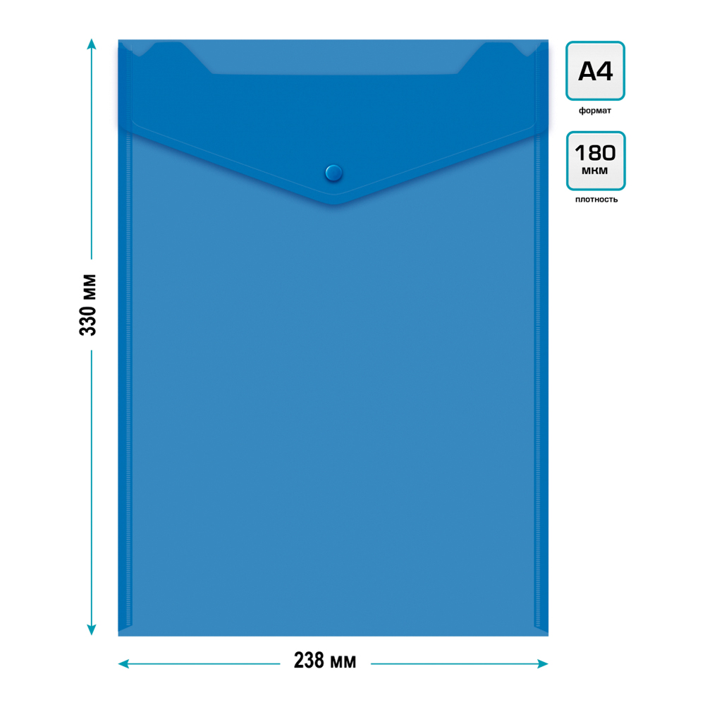 Выполнена из прозрачного пластика толщиной 0,18 мм, который защищает бумаги от пыли и лёгких загрязнений. Удобная кнопка-застёжка надёжно фиксирует содержимое, а вертикальный формат упрощает хранение и сортировку документов в офисе, учебе или дома.