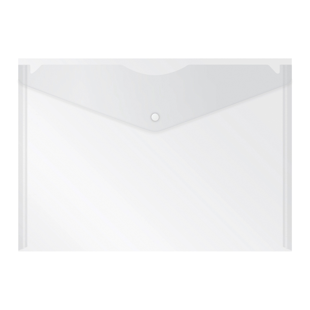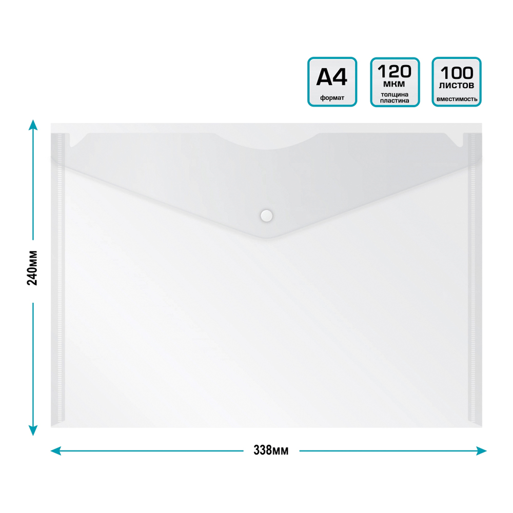 Изготовлена из тонкого и экологичного пластика толщиной 0,012 мм, который защищает бумаги от пыли и лёгких загрязнений. Прозрачный дизайн позволяет сразу видеть содержимое, а удобная кнопка-застёжка надёжно фиксирует документы, предотвращая их выпадение.