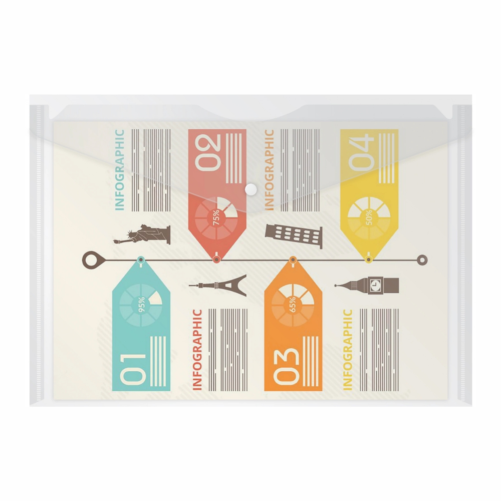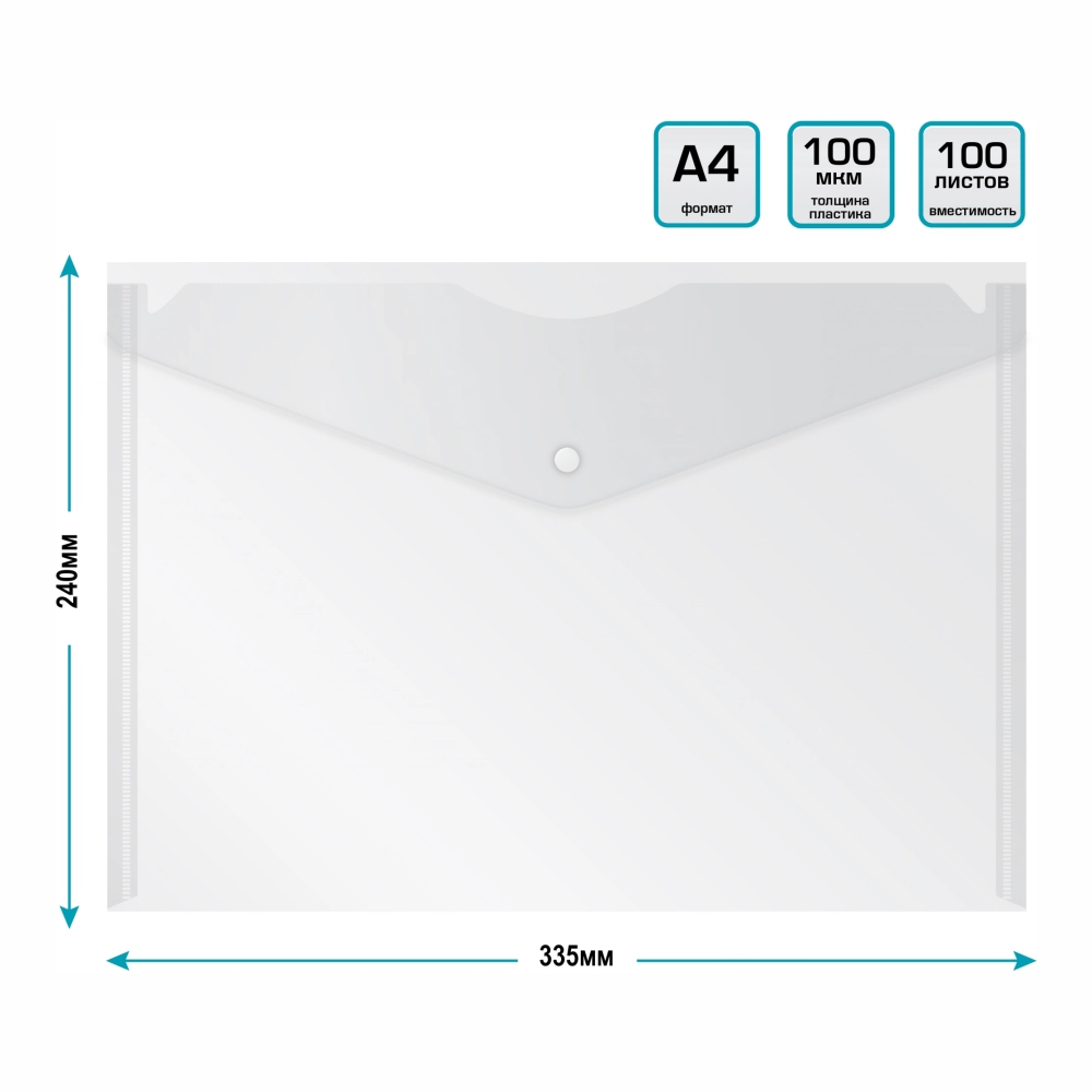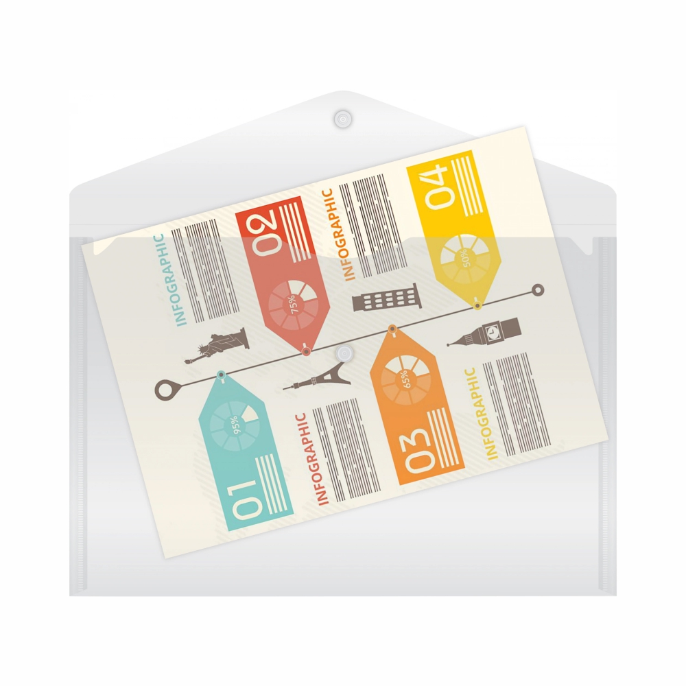 Изготовлена из прочного прозрачного пластика толщиной 0,10 мм, который защищает бумаги от пыли, влаги и лёгких повреждений. Удобная кнопка-застёжка надёжно фиксирует содержимое, позволяя легко переносить документы и одновременно видеть их без открытия папки.