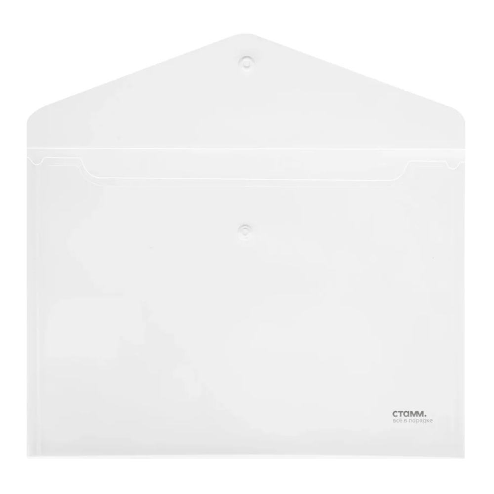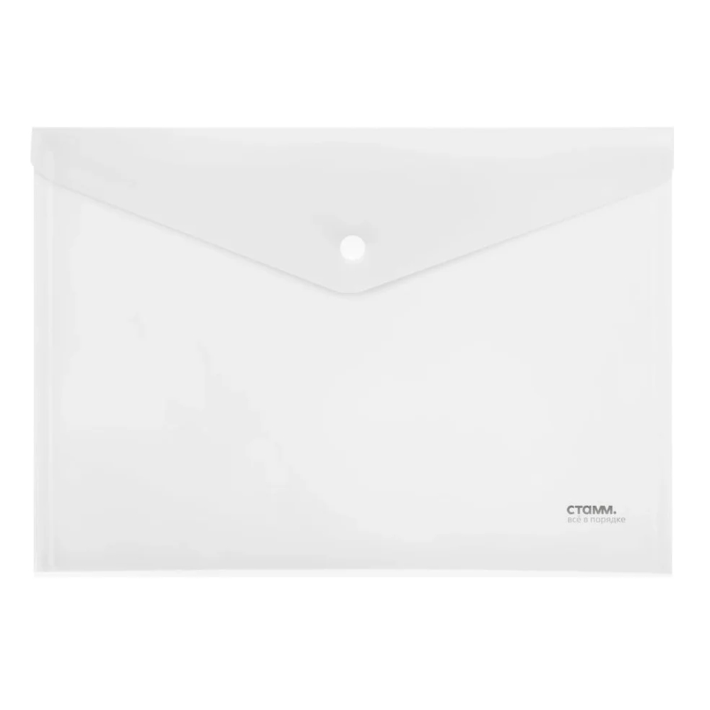 Папка с кнопкой формата А4 от Стамм — практичное решение для хранения и переноса документов. Изготовлена из прозрачного пластика толщиной 180 мкм, который защищает бумаги от загрязнений, влаги и механических повреждений, при этом позволяет легко видеть содержимое.