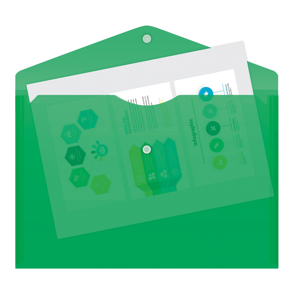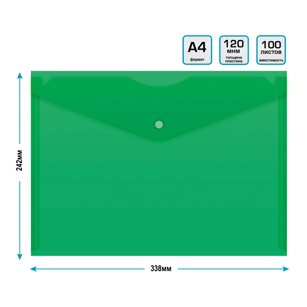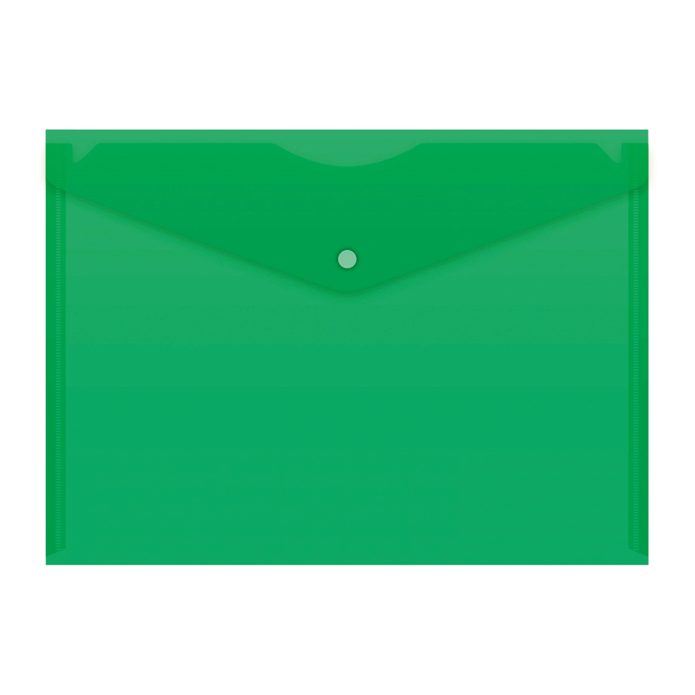 Изготовлена из тонкого и экологичного пластика толщиной 0,012 мм, который защищает бумаги от пыли и лёгких загрязнений. Удобная кнопка-застёжка надёжно фиксирует содержимое, а яркий зелёный цвет помогает легко классифицировать документы.