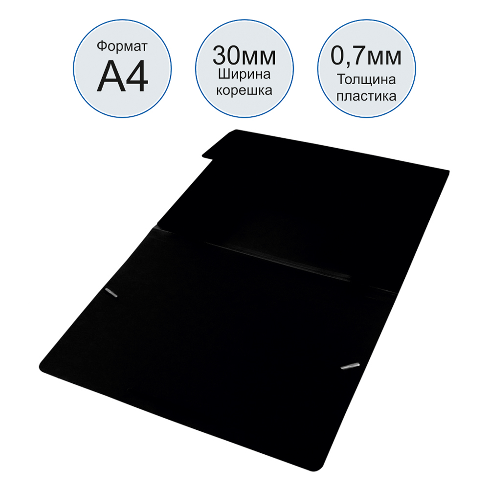 Изготовлена из плотного, прочного пластика, который защищает бумаги от влаги, загрязнений и повреждений. Удобные резинки-застёжки надёжно фиксируют содержимое, а классический чёрный цвет придаёт папке строгость и деловой стиль.