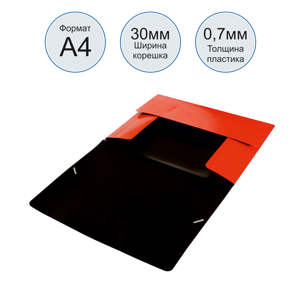 Изготовлена из плотного, прочного пластика, который защищает бумаги от влаги, загрязнений и механических повреждений. Удобные резинки-застёжки надёжно фиксируют обложку, а насыщенный красный цвет придаёт папке выразительность и энергию.