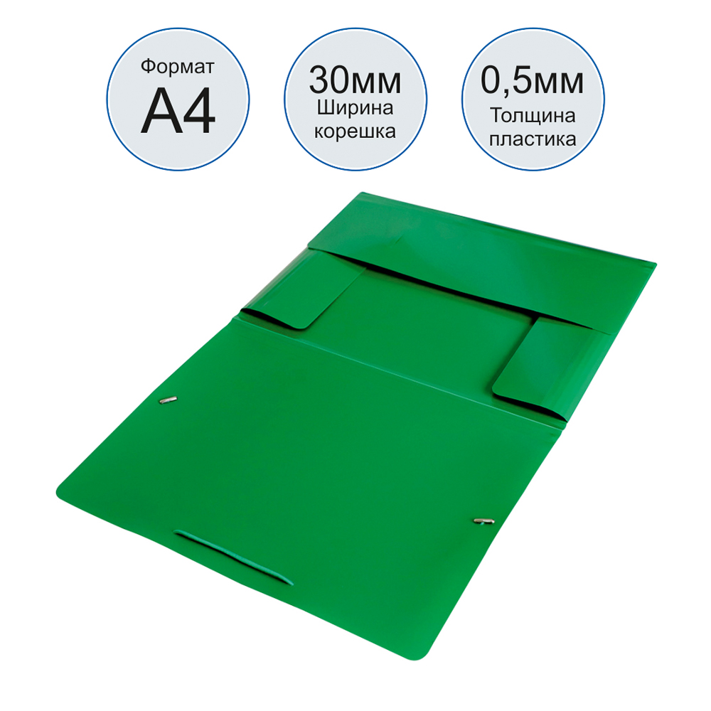 Изготовлена из прочного пластика толщиной 0,5 мм, который защищает бумаги от влаги, пыли и заломов. Удобные резинки-застёжки надёжно фиксируют обложку, предотвращая выпадение бумаг, а насыщенный зелёный цвет придаёт папке свежий и аккуратный вид.