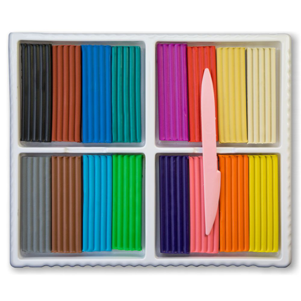 В наборе шестнадцать цветов. В комплектацию входит стек, который помогает в лепке мелких деталей.