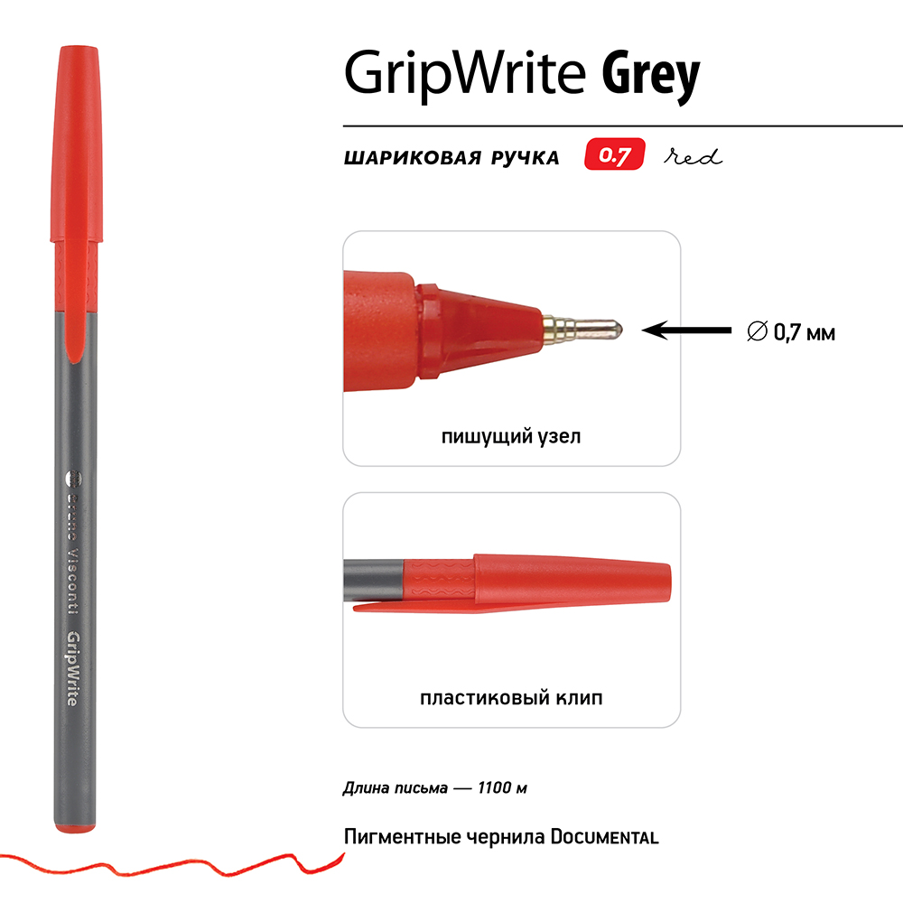 Ручка шариковая - красный стержень 0.7мм. "GripWrite Grey" (Bruno Visconti)
