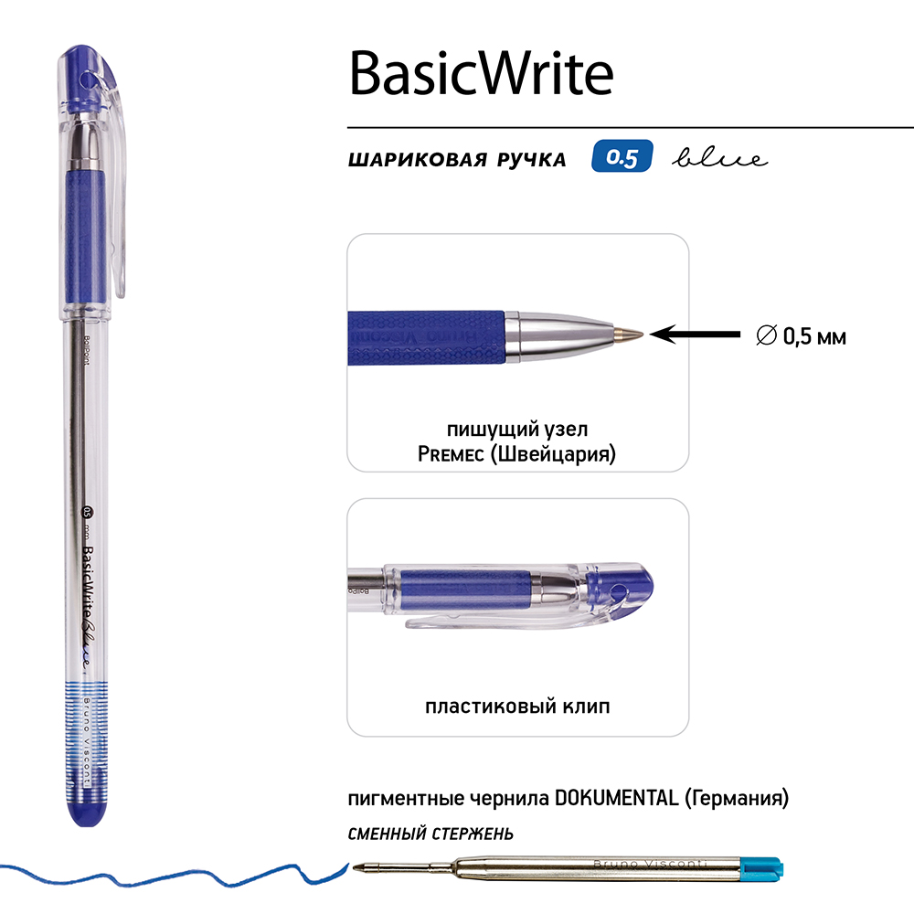 Ручка шариковая - синий стержень 0.5мм. "BasicWrite Grip" (Bruno Visconti)