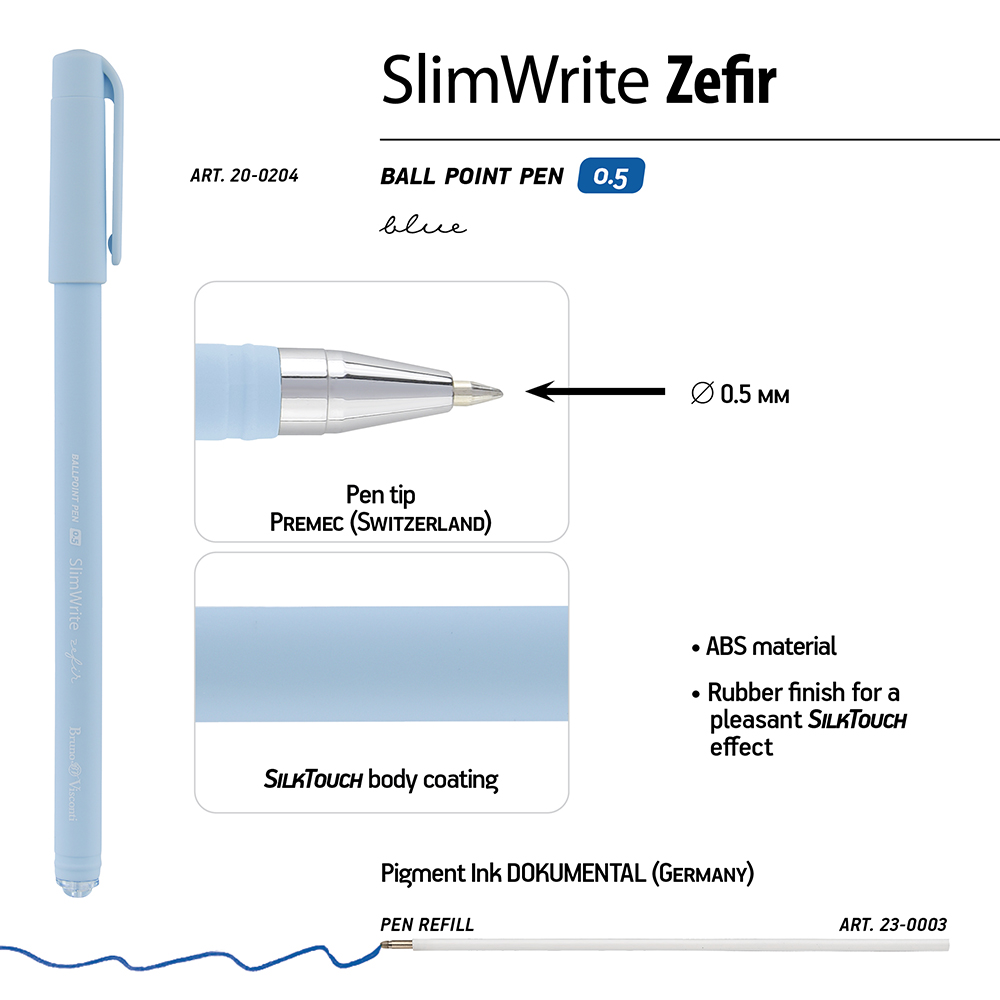 Ручка шариковая - синий стержень 0.5мм. "SlimWrite. Zefir" (Bruno Visconti)