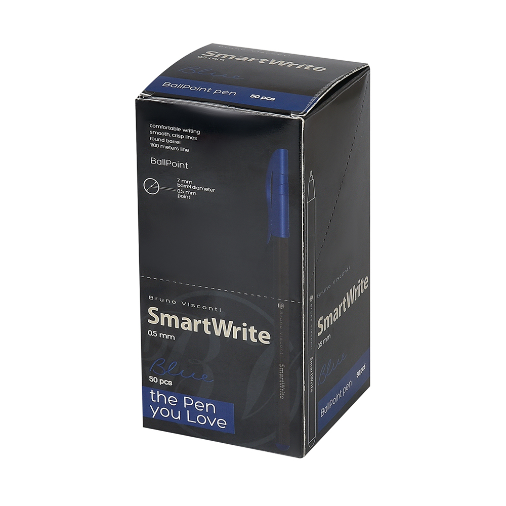 Ручка шариковая "SmartWrite Black" – синий стержень 0.5 мм (Bruno Visconti). Тонкая и точная шариковая ручка для аккуратного письма и профессиональных записей. Синий стержень 0.5 мм обеспечивает четкие, ровные линии, идеально подходящие для конспектов, заметок и официальных документов. Эргономичный корпус с мягкой прорезиненной вставкой обеспечивает комфортный захват и удобство даже при длительном письме.