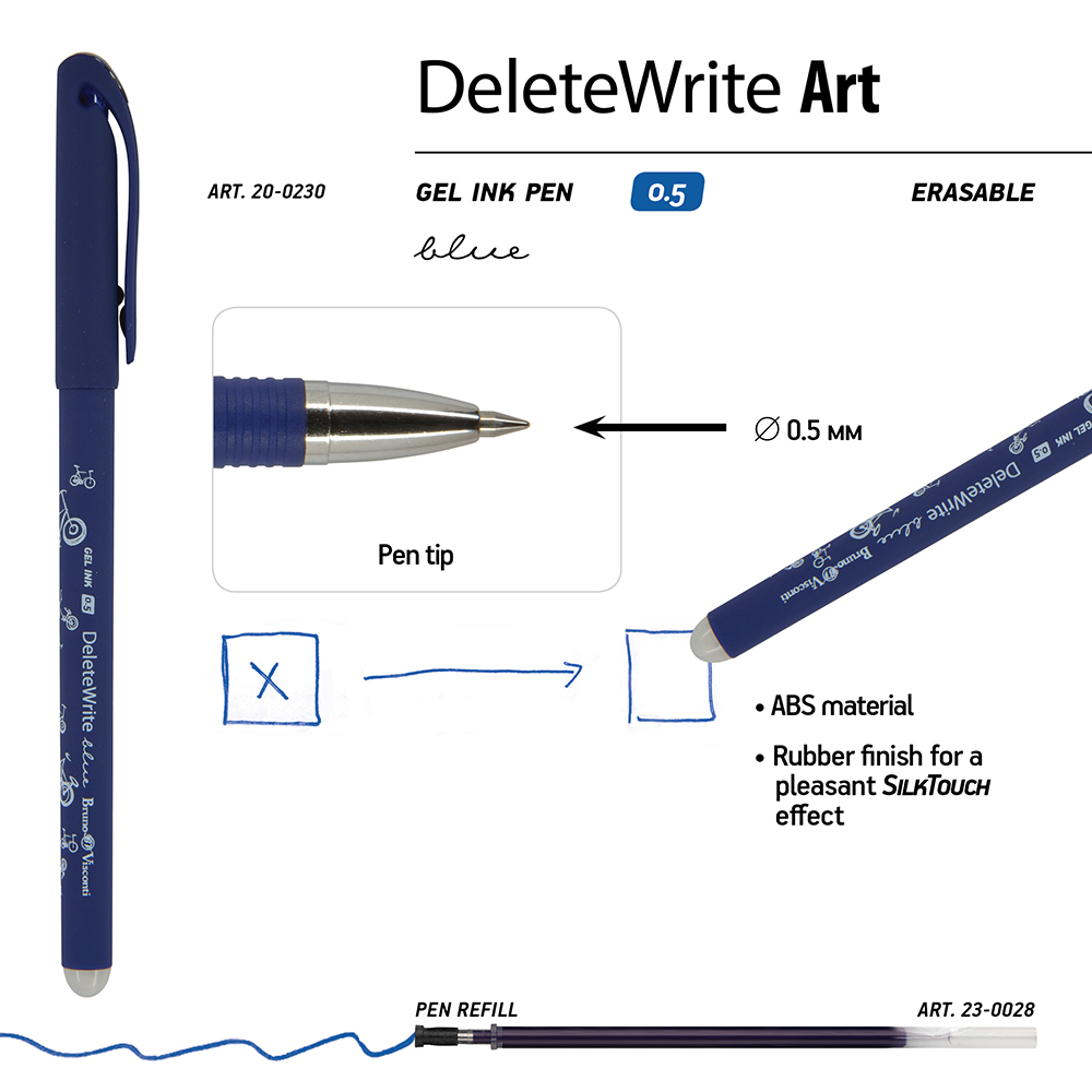 Ручка «DeleteWriteArt. Велосипеды» со стираемыми чернилами от BrunoVisconti – отличное предложение для тех, кто ценит качество и надежность. «DeleteWrite» - ваш идеальный помощник в деле исправления ошибок или удаления помарок при работе с деловыми документами или учебными задачами.