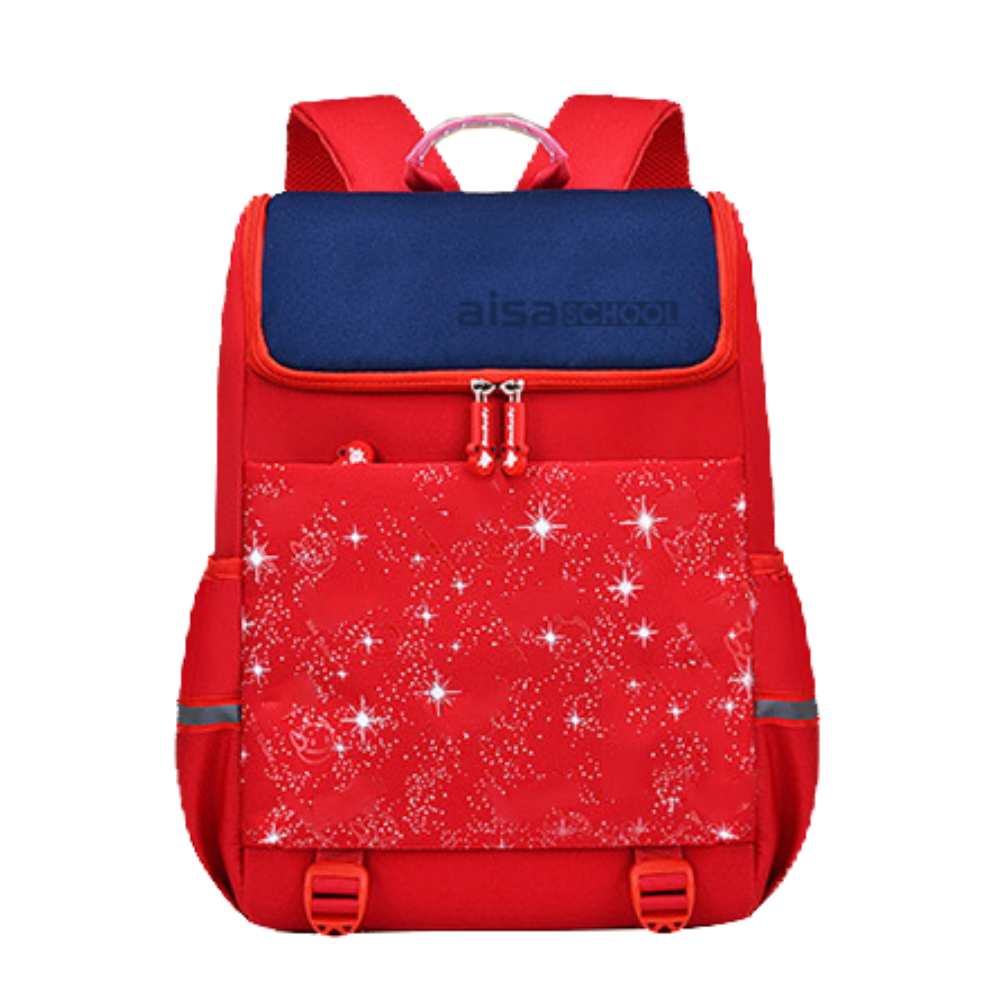 Рюкзак c мягкой спинкой для девочек представленный торговой маркой AISA SCHOOL - легкий и удобный, и в то же время достаточно вместительный. Отличный вариант не только для учебы, но и для повседневных дел, прогулок, или коротких поездок. В рюкзаке одно отделение на молнии. Один вместительный фронтальный карман на молнии и два кармана с боковых сторон. На переднем кармане изображены звездочки, напоминающие галактику. Цвет рюкзака красный. Лямки удобные и мягкие, оснащены светоотражающей полоской, которая может обезопасить ребенка в темное время суток во время дорожного движения. Для дополнительного удобства переноски имеется ручка. В нижней части предусмотрены два крепжных ремешка.