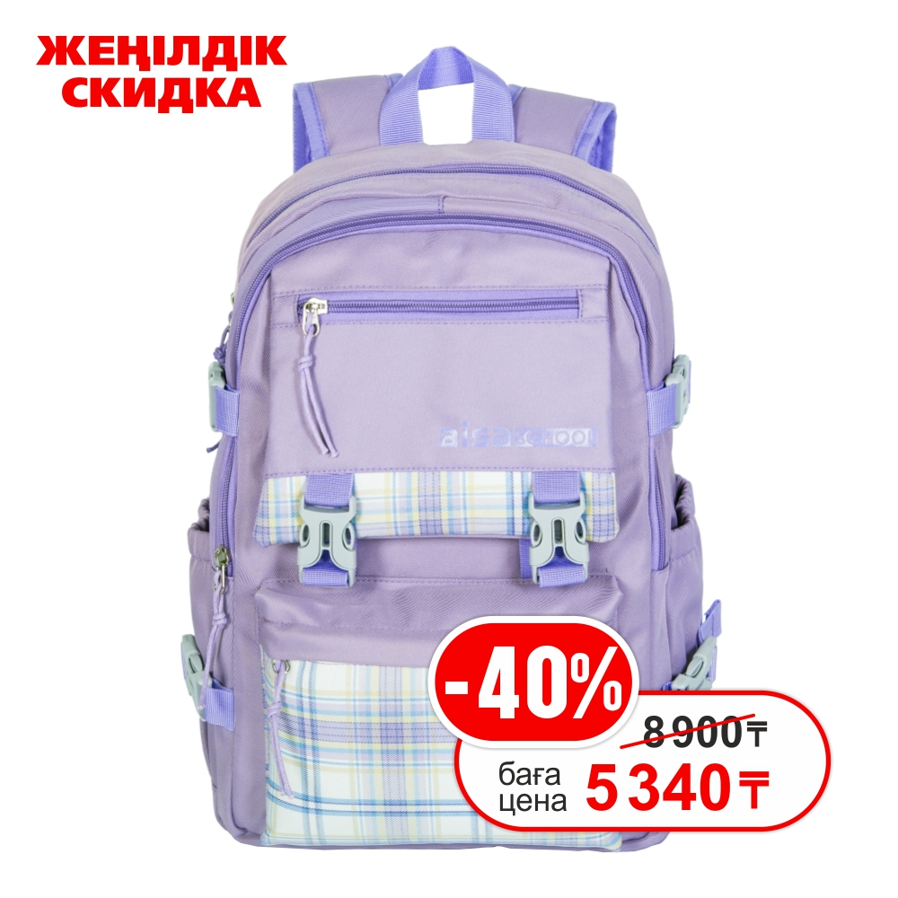 Рюкзак AISA SCHOOL является самым необходимым предметом для учебного процесса Вашего ребенка. Отлично подойдет для девочек младших и  средних классов. Рюкзак объемный, поэтому его можно использовать и вне школы. Дизайн рюкзака представлен в сиреневом цвете, с использованием принта ввиде клетки. Рюкзак имеет два вместительных отдела: один основной отдел и второй отдел поменьше с двумя сетчатыми карманами-вкладками. На фронтальной части рюкзака два кармана на молнии для письменных принадлежностей, и один дополнительный карман на молнии для мелких вещей. По бокам имеется два кармана и с четырьмя боковыми крепежными ремнями. Прочные и удобные лямки рюкзака регулируются по росту ребенка  и позволяют ребенку удобно носить рюкзак на спине, так же есть  ручка для переноски и нагрудный ремень. Рюкзак изготовлен из легкого и прочного полиэстера. На спинке рюкзака предусмотрен небольшой дополнительный карман на молнии для школьных принадлежностей, либо дополнительных аксессуаров. Размер рюкзака 42х28х16 см.