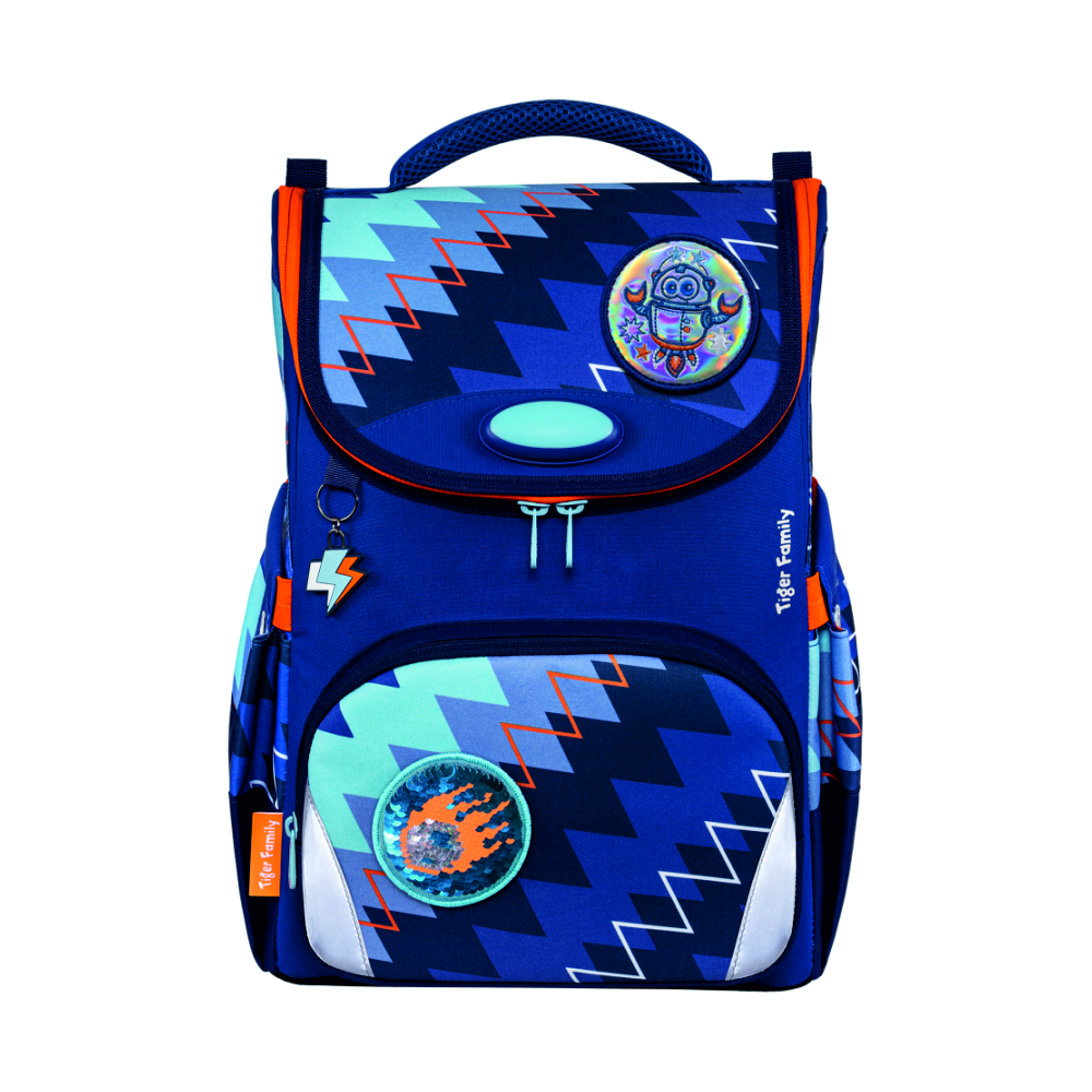 Рюкзак оформлен яркими декоративными элементами – 2 съемных патча: глянцевый на верхнем клапане (в виде робота) и с двусторонними пайетками на переднем кармане (в виде летящей кометы), декоративный брелок-подвеска в форме грома.