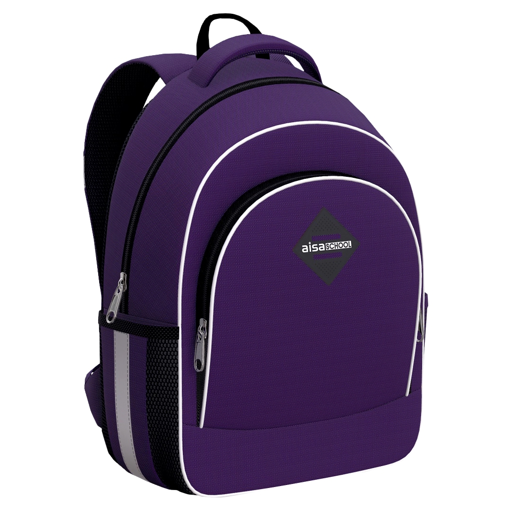 Рюкзак с эргономической спинкой "Aisa School 15L Deep Violet” в фиолетовом цвете, объёмом 15 л изготовлен из полиэстера  с полиуретановой пропиткой, что делает его устойчивым к износу и морозу. Внутри вместительное отделение с эластичным фиксатором для тетрадей и учебников формата А4+. Также есть мини-органайзер для мелкой канцелярии и карман на молнии. На дне – жёсткая откидная вставка. Снаружи фронтальный карман на молнии с плавным ходом, а также два боковых на резинке, куда можно положить бутылку с водой или зонтик. У модели эргономичная спинка из мягких подушечек равномерно распределяет вес рюкзака и снижает нагрузку на позвоночник. Мягкие S-образные лямки не давят на плечи ребёнка. Светоотражающие элементы по всему периметру повышают безопасность в темноте. Модель также оснащена объёмной и удобной ручкой для переноски в руке. Пластиковые ножки защищают от загрязнений и влаги. Рюкзак "Aisa School 15L Deep Violet" – оптимальный выбор для занятий в школе. Размер 35х29х14 см.