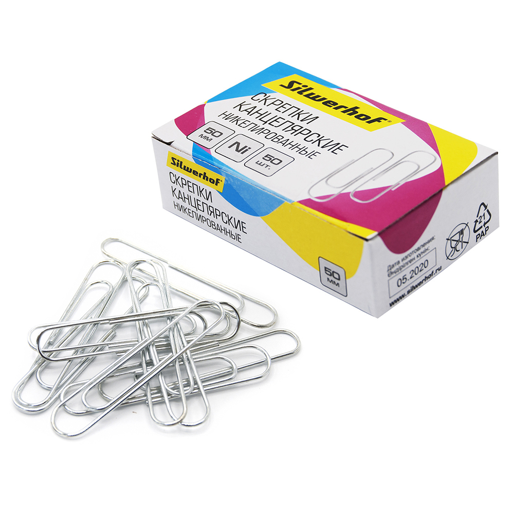 Скрепки 50 мм, 50 шт. (Silwerhof). Прочные и надёжные скрепки Silwerhof предназначены для скрепления больших документов и стопок бумаги. Металлический материал обеспечивает долговечность, а универсальная длина 50 мм подходит для большинства офисных и учебных задач.