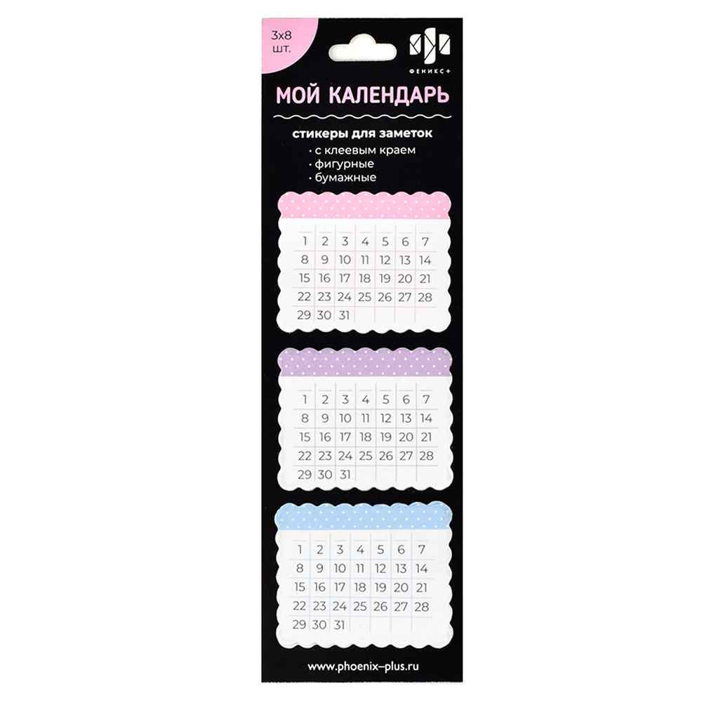 Стикер-календарь 50×40 мм, 3×8 шт., «МОЙ КАЛЕНДАРЬ» (Феникс). Практичный стикер-календарь «МОЙ КАЛЕНДАРЬ» от Феникс позволяет удобно планировать дни, недели и важные события. Компактный формат и самоклеящаяся поверхность обеспечивают простоту использования — наклейте стикер на рабочий стол, тетрадь или блокнот.