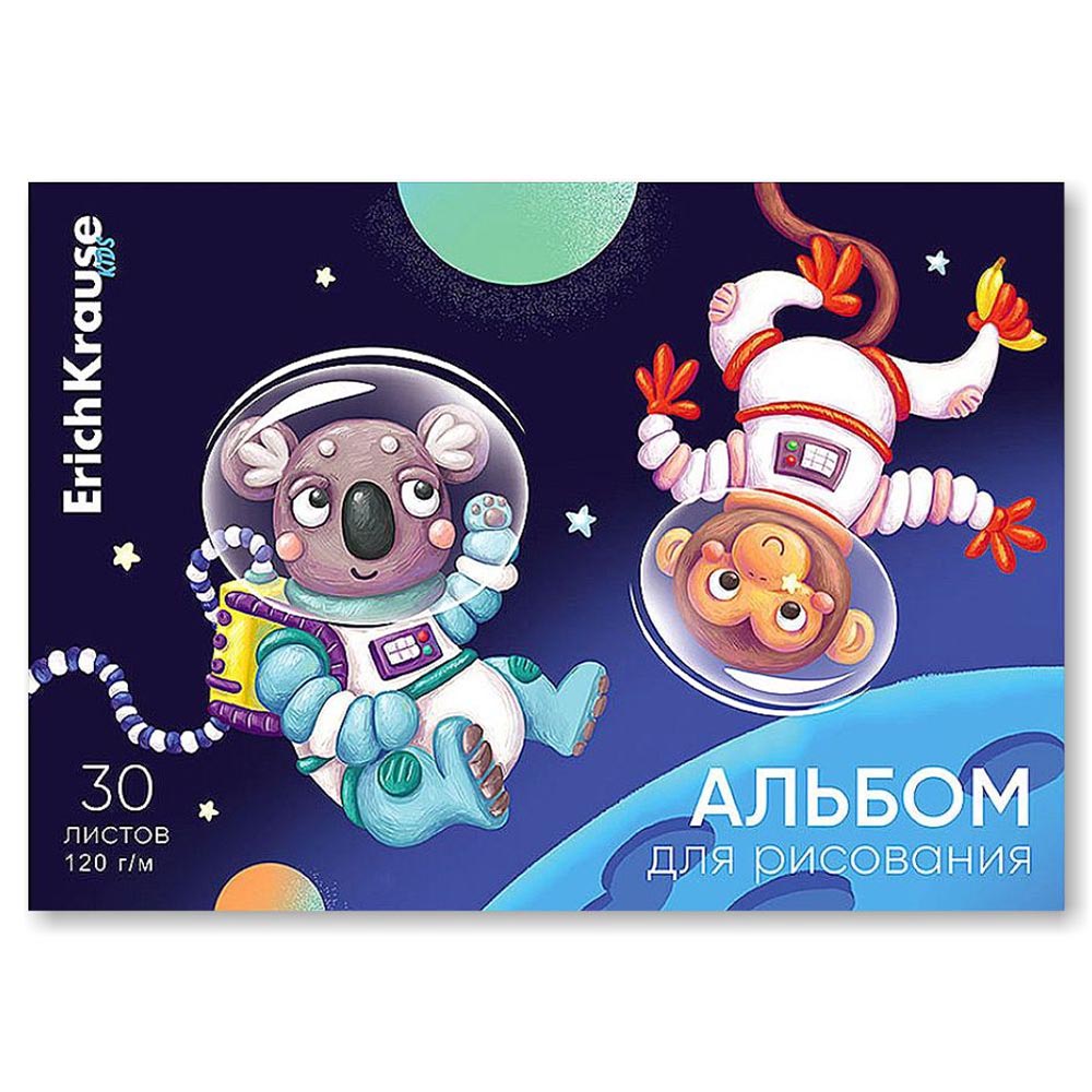 Альбом для рисования «Space Animals» формата А4 (297x210 мм) представлен брендом ErichKrause. Обложка из высококачественного мелованного картона плотностью 170 г/м2. Жесткая подложка 360 г/м2. В блоке 30 листов. Бумага плотностью 120 г/м2. Белизна бумаги - 100%. Тип скрепления - клей. Альбомы упакованы в термоусадочную пленку по 8 штук.
