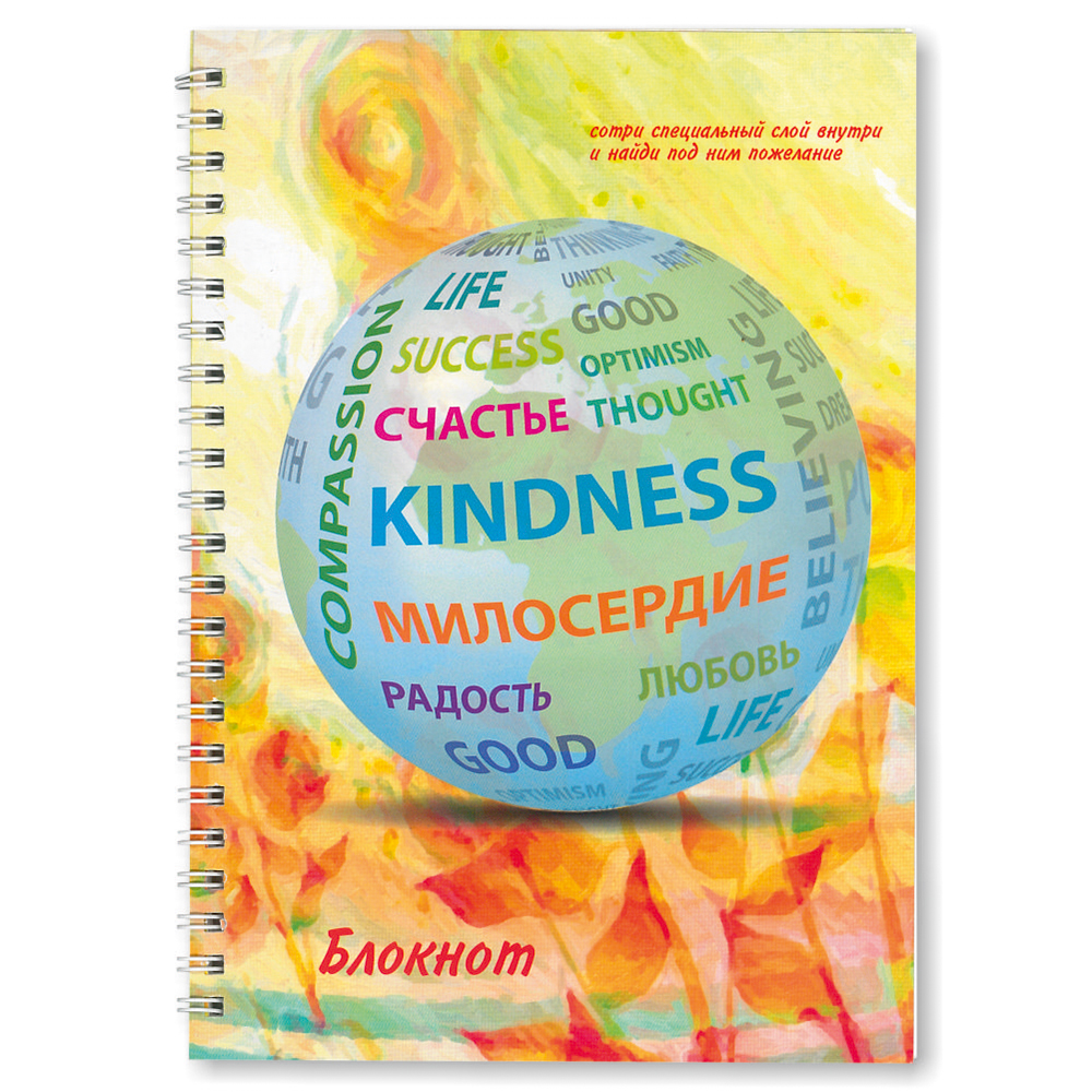 Блокнот закреплен на евроспирали, внутренний блок сделан из офсетной бумаги в клетку, дизайн обложки выполнен из мелованного картона.
