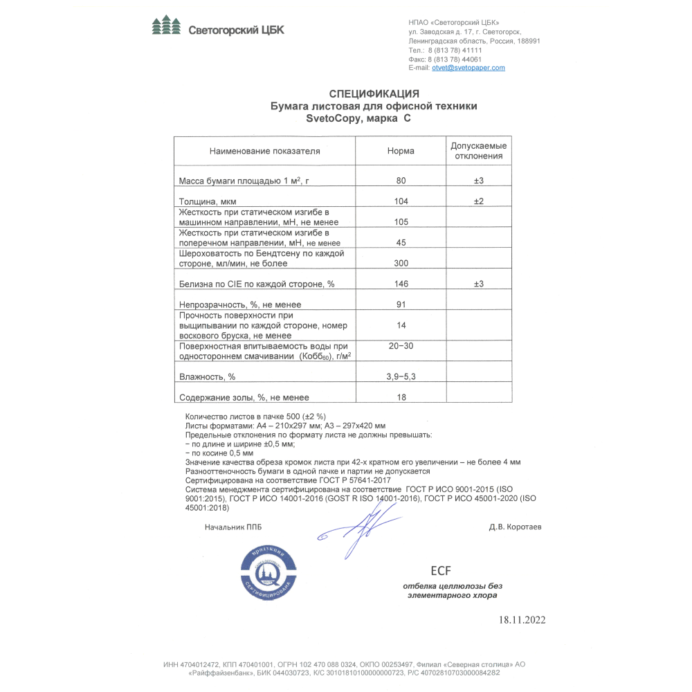 Предлагаем Вам бренд № 1 в категории «Бумага для офиса» - "SVETOCOPY" формата А4, проверенная временем и пользователями. Особенностью является оптимальная плотность и высокая степень белизны - 96% (ГОСТ), 146% (CIE). Плотность бумаги составляет 80 г/м2 предназначена для работы в принтерах и копировальных аппаратах. Она подходит для многих видов печати, таких как: копирование, для факса, лазерная, струйная. Соответствует ГОСТ Р 57641–2017.