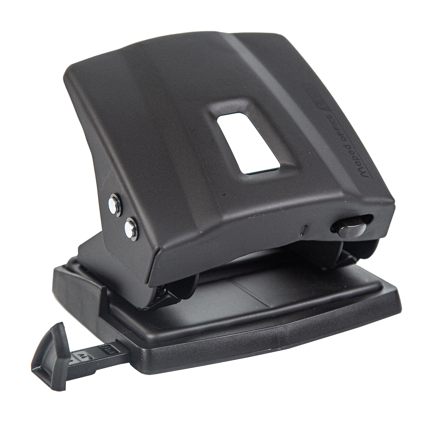 Аксессуар полностью сделан из прочного металла. Даже при максимальной нагрузке этот дырокол Вас не подведет! Пробивная способность тридцать-тридцать пять листов, по два отверстия круглой формы диаметром пять с половиной миллиметра. Оснащен съемным пластиковым контейнером, который предназначен не только для сбора конфетти, но и предохраняет поверхность стола от повреждений. В модели также предусмотрены центровочные метки и выдвижная линейка, с нанесенными деления разных форматов, что предотвратит неправильные проколы. Способен пробивать несколько форматов бумаги, а именно: A4, US, A5, F3x8, A6, 3x8. Цветовое оформление выполнено в сдержанной черной цветовой гамме.