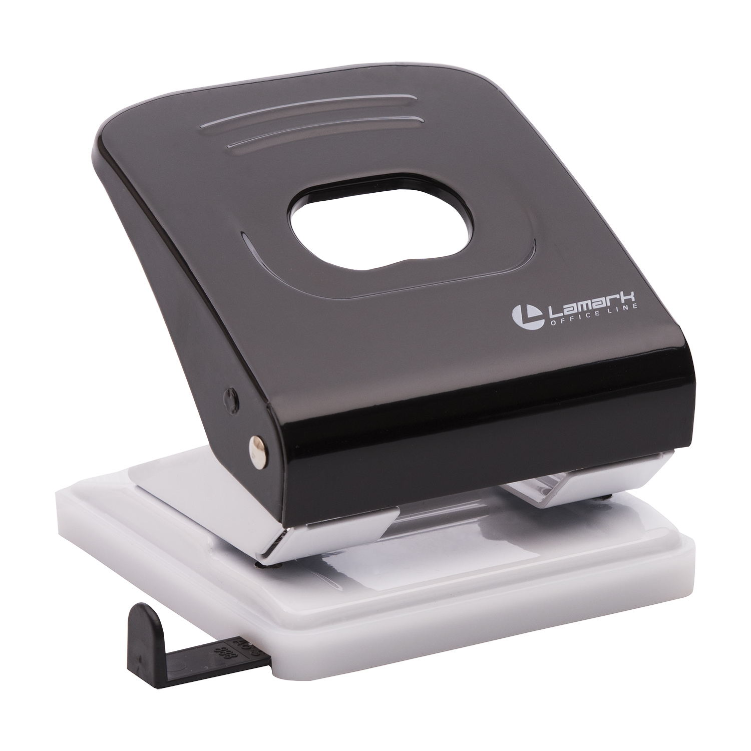 Полностью металлический дырокол Lamark серии Metallic на 2 отверстия диаметром 5,5 мм оснащен линейкой деления на форматы и пластиковым поддоном-основанием для сбора конфетти.