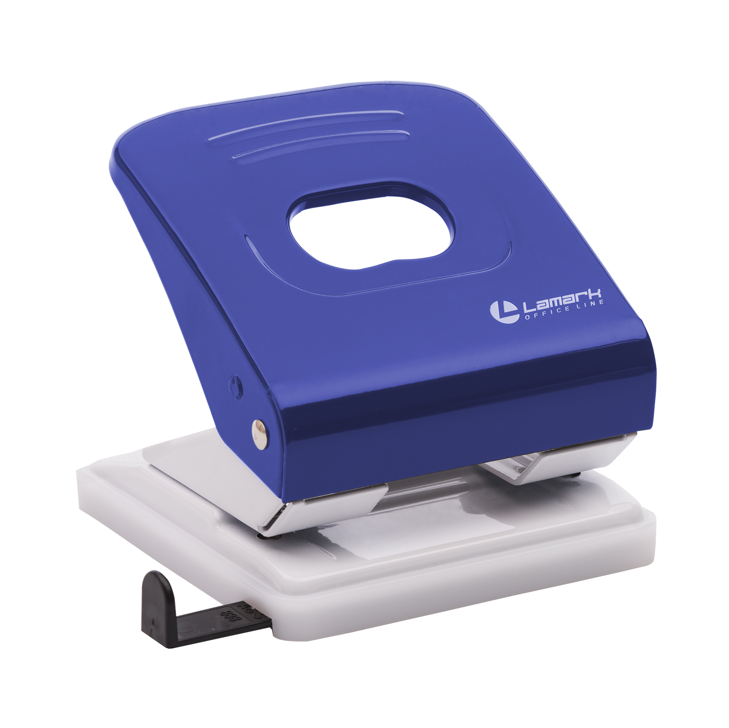 Полностью металлический дырокол Lamark серии Metallic на 2 отверстия диаметром 5,5 мм оснащен линейкой деления на форматы и пластиковым поддоном-основанием для сбора конфетти.