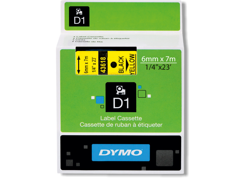 Этикет лента желтого цвета/черный шрифт "D1" пластиковая от торговой марки DYMO обеспечивает высокую производительность, необходимую для выполнения большинства задач по маркировке. Эта лента для изготовления этикеток приклеивается практически ко всем чистым, плоским поверхностям, включая пластик, металл и стекло, и имеет легко отделяемую подложку для быстрого нанесения этикеток. Лента для этикеток созданная для того, чтобы избавить вас от хлопот в организации дома и офиса. Размер: 6 мм х 7 м.