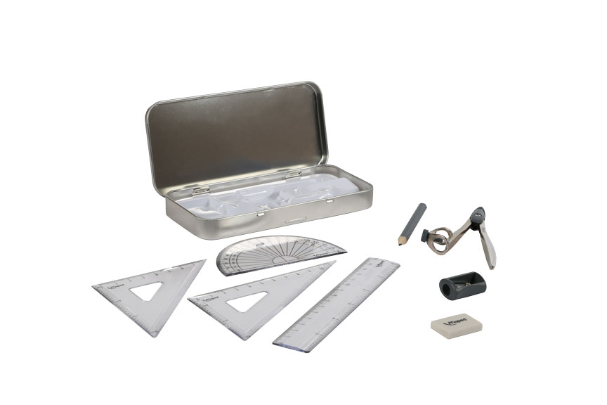 У готовальни "STUDY" стильный дизайн: прямоугольная форма с округлыми краями, цвет - металлик. Канцелярские предметы соответствуют всем стандартам качества. В комплектацию входят восемь предметов, а именно: