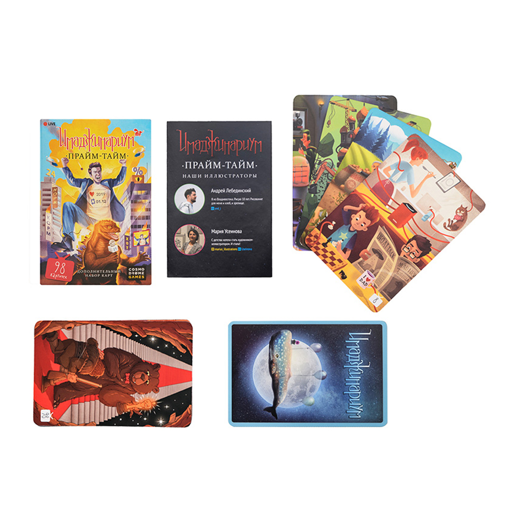 По очереди загадывается не самые очевидные, но и не очень трудные ассоциации на иллюстрации. Дополнение используйте в комбинации с полем любого «Имаджинариума» с его фишками и фигурками. Смело смешивайте карточки «Прайм-тайм» с другими выпусками.