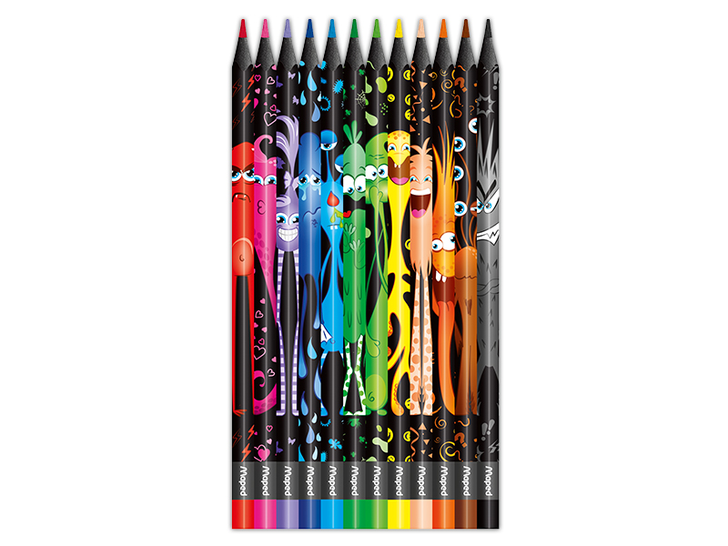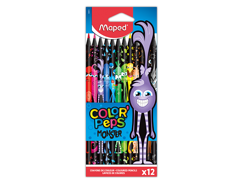 Цветные карандаши «Color’Peps Monster» от Maped всегда удобны в использовании. Легко точаться. Яркие цвета. Картонная коробка с 12 треугольными цветными карандашами, которые удобно держать в руке. Имеют стандартный грифель диаметром 2,9 мм.  Эргономичная треугольная форма удобна даже для маленьких детей. Цветные карандаши декорированы изображениями монстров. Каждый монстр имеет свой цвет и настроение.