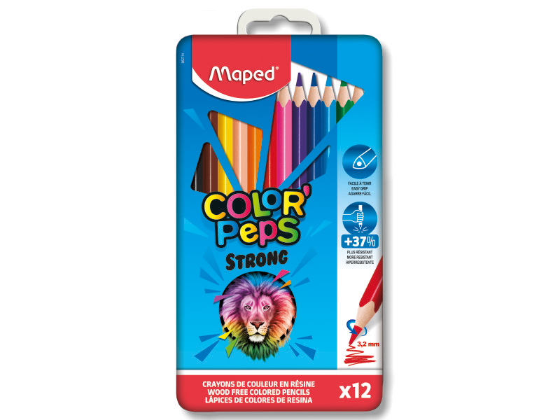 Цветные карандаши «Color’Peps Strong» от Maped. Легко точаться. Яркие цвета. Металлическая коробка с 12 треугольными цветными карандашами. Имеют ударопрочный стандартный грифель диаметром 3,2 мм. Эргономичный трехгранный корпус, который удобно держать в руке. Не образуют щепок на изломе, тем самым обеспечивая дополнительную безопасность.