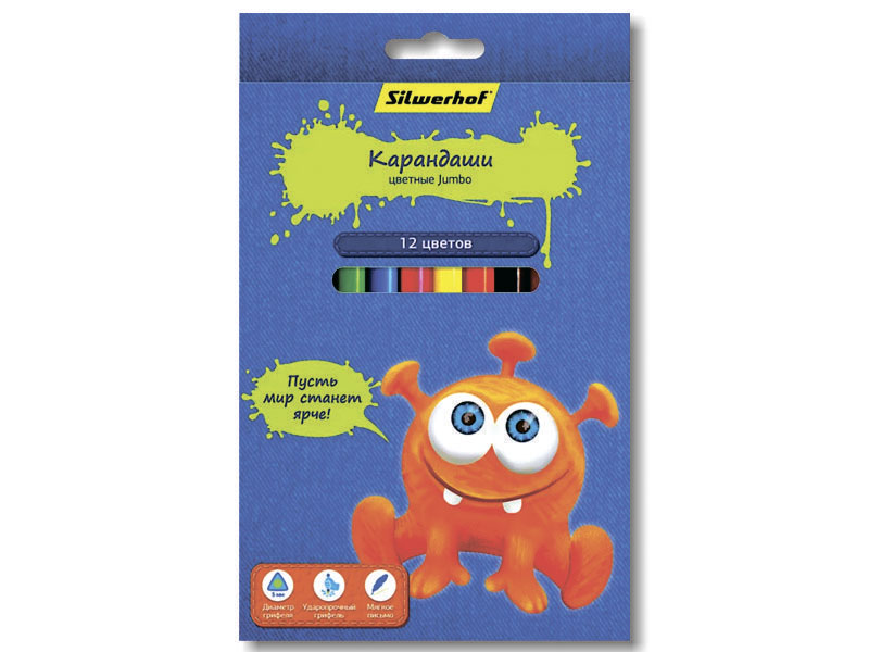 Карандаши в наборе цветные "Джинсовая коллекция. Jumbo" от торговой марки Silwerhof, 12 цветов в упаковке. Корпус цветных карандашей трехгранный, что позволяет естественным образом располагать три пальца. Прекрасное качество карандашей Silwerhof определяется двумя характеристиками: высококачественной древесиной в сочетании с грифелем увеличенного диаметра 5 мм, который легко скользит по бумаге, дарит мягкость письма и яркость цветовой палитры. Прочный неломающийся грифель не требует сильного нажатия и легко затачивается.
